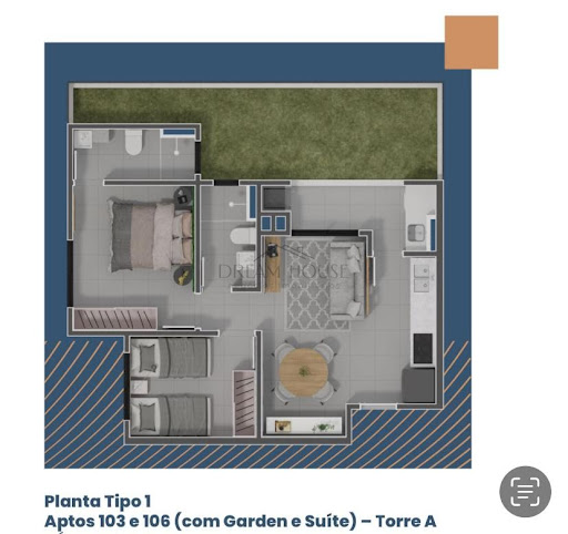 Este empreendimento oferece um apartamento com dois dormitórios, sendo um suíte, living integrado, dois banheiros e um charmoso Garden de 15 m² para seus momentos de lazer.